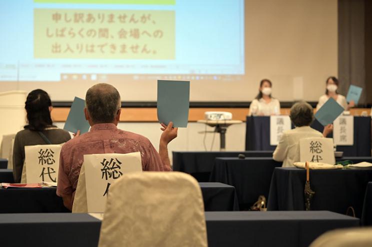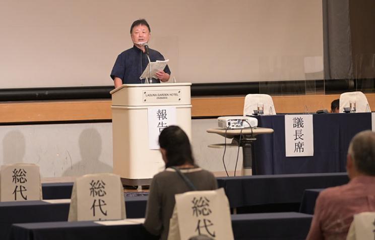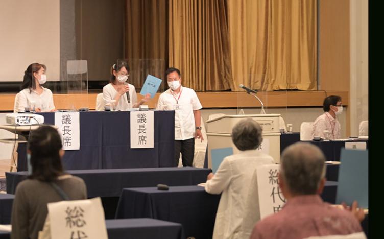 6月21日、コープおきなわ第47期通常総代会が開催されました。コロナ禍の中、書面を中心に総代350人が出席し、すべての議案が賛成多数で可決されました。今年は役員改選も行われ、役員24名が選任されました。