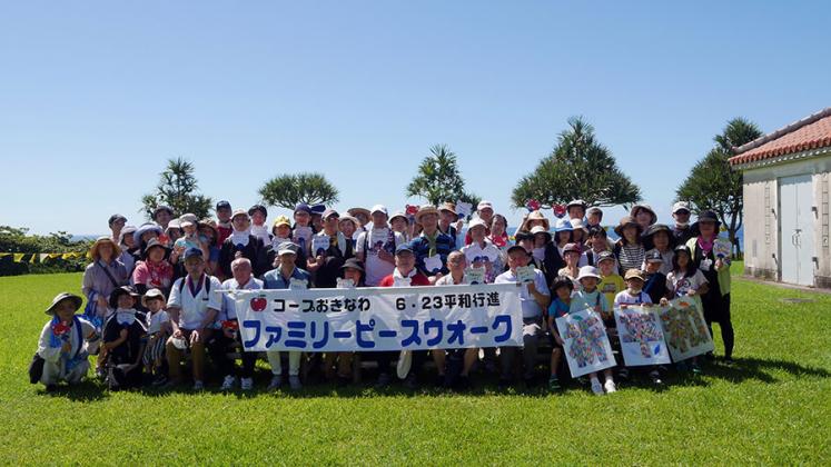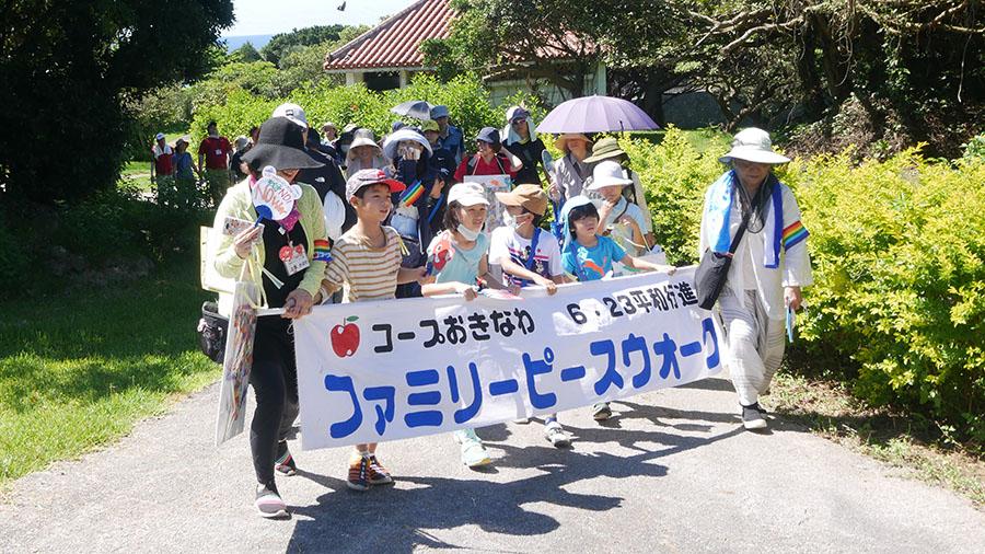 沖縄戦終焉の地を歩きながら、沖縄戦と平和について家族で考える「6.23ファミリーピースウォーク」がコロナ感染拡大防止対策を行いながら、今年も規模を縮小しての開催となりました。会場には、県内外の組合員さんから寄せられた平和のメッセージが掲げられ、かつての激戦地を歩き、平和の大切さを思う貴重な時間となりました。