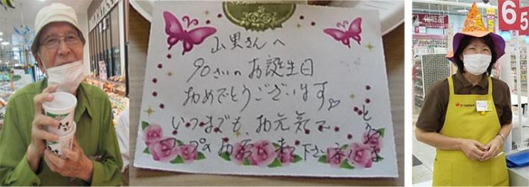 組合員「山里のおじいちゃん」が下地徹店長に話しかけてきました。「ここの従業員は何でこんなに素晴らしい人ばっかりなの、どうやって採用したの?店長」「レジの當山淳子さん。私の誕生日に書いてくれたカード、冷蔵庫に貼っていつも喜んで見てるさ~(笑)」ととても嬉しそうに話してくれました。山里のおじいちゃんは90歳になる組合員さんです。ほぼ毎日!買い物に来ては、職員との会話をとても楽しんでいます。