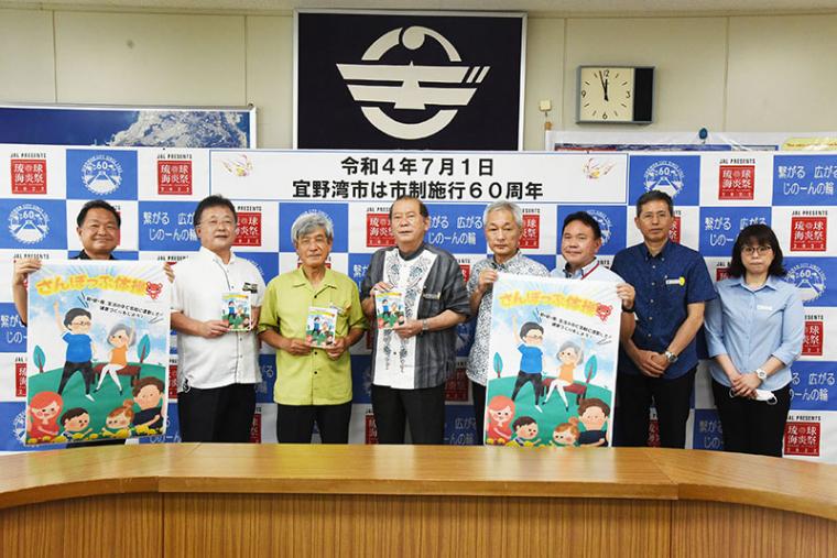 集合写真は、2022年5月24日、コープおきなわ川越雄一郎理事長と宜野湾市社会福祉協議会多和田眞光会長(当時)と一緒に宜野湾市の松川正則市長を訪問。『さんぽっぷ体操』の完成報告とDVDの寄贈を行いました。