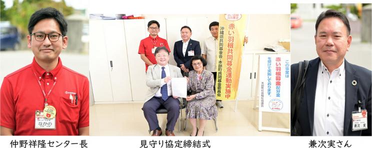 仲野センター長が総合推進室兼次実さんに「自分が担当する北部エリアで見守り協定を進めたい」と相談したのが始まりでした。さっそく、仲野さんと兼次さんで本部町社協さんに挨拶に伺い、意見交換をしました。本部町では、最近県外からの移住者は増えてはいるものの自治会や商工会などの地域内でのつながりが弱いこと、見守り協定も保育園などと締結しているが、あまり機能していないことなど、地域の困りごとを教えて頂き、見守り協定の申し入れを大変喜ばれました。
