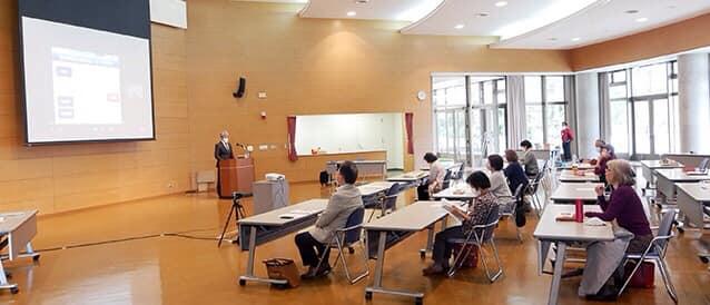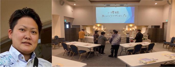 入協3年目の平良夢樹さんが初めて葬祭学習会講師を務めました。テーマの「葬儀の流れや費用」「家族葬」について、どうすれば参加者に分かり易く伝えることができるか、と自分の培ってきた知識にネット情報を組み合わせ、ひやごんホールの強みである大型スクリーンを使って、説明することにしました。また、実際に葬儀で使用する棺や骨壺、祭壇を展示し、より身近に感じていただけるように工夫をしました。事前の準備はそれだけではありません。葬祭メンバーを相手にロープレを繰り返し、時間配分や伝わり易さを追求しました。