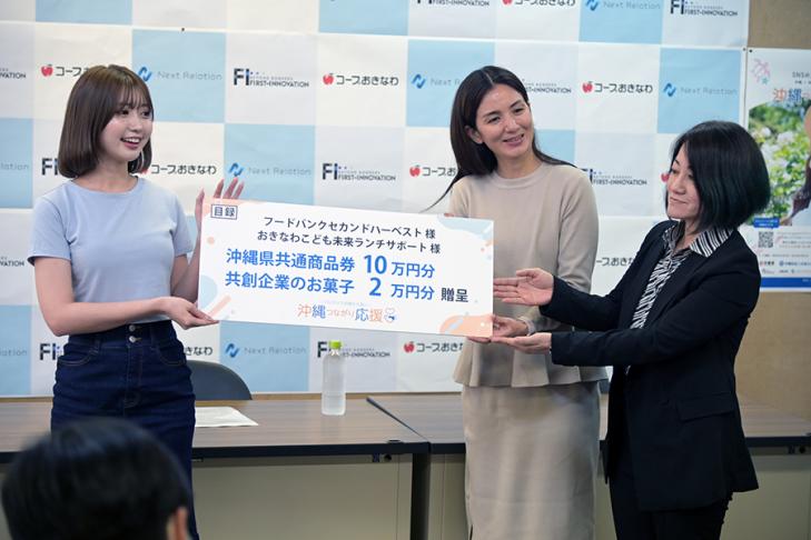 公式アンバサダーのあやちさんより、おきなわこども未来ランチサポートの富田様、NPO法人フードバンクセカンドハーベスト沖縄の奥平様へ商品券とお菓子を贈呈しました。