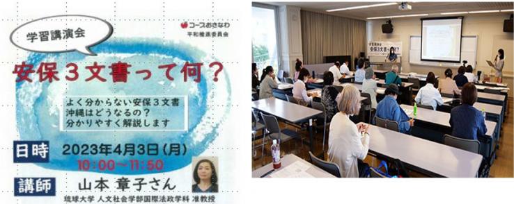 平和推進委員会では、琉球大学准教授山本章子さんを講師に迎え、「安保3文書って何?」をテーマに学習講演会を開催しました。ハイブリッド開催としたことで、県外の生協役職員も含め、64名(会場26名・Zoom38名)の参加がありました。