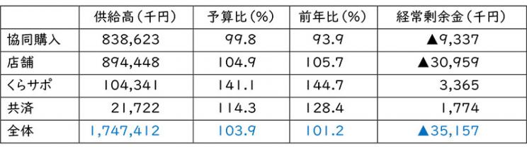 供給高は、店舗・ハウジング・葬祭・共済が好調に推移し、17.5億円で、予算・前年ともに超過しました。コロナ禍の収束にともない、店舗における清明祭需要の回復や、葬祭では家族葬が減少し、告別式が増えたことでの葬儀単価の上昇などが主な要因です。