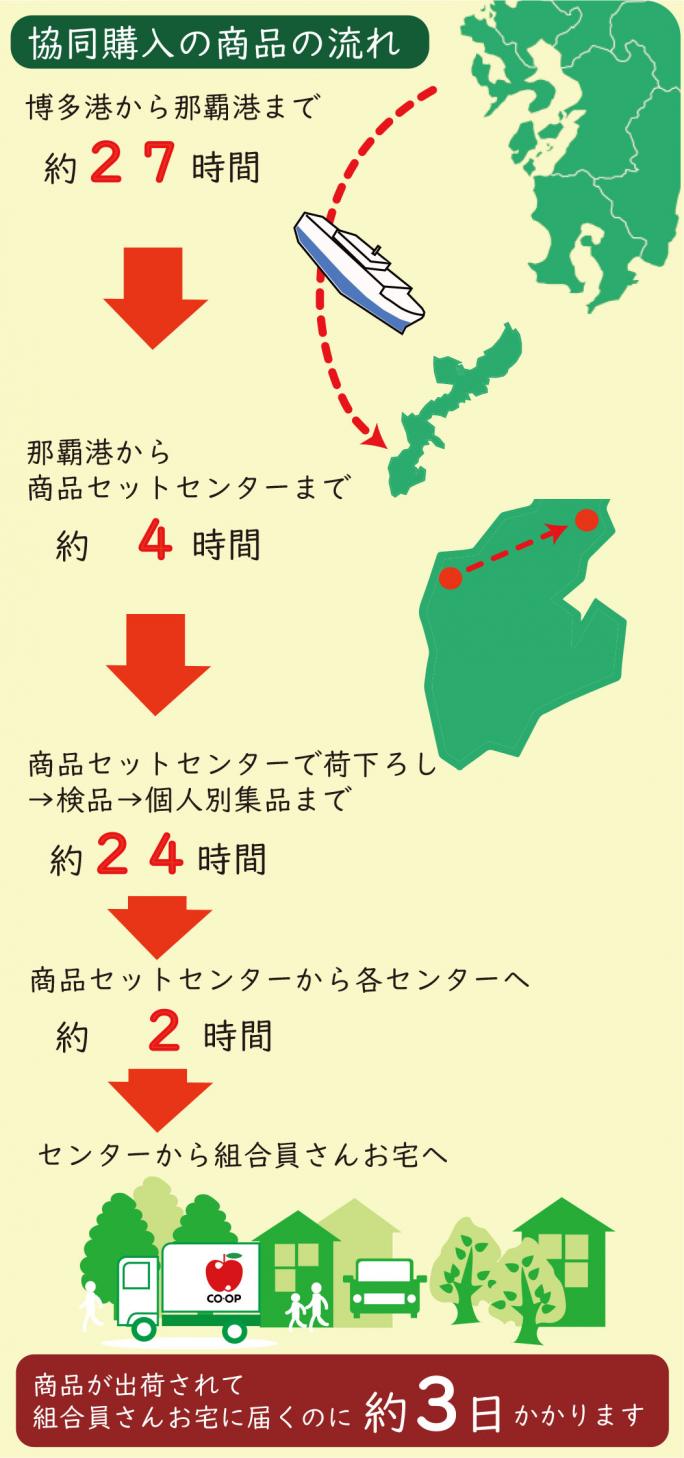 コープおきなわの協同購入は、お届けする商品の7割が県外から届きます。台風が発生すると九州からの船の遅延や欠航があった場合、商品セットセンターでは船の到着時間に合わせるため、例えば夜中の荷受けなどの通常の時間とは違う変則的な対応が必要になり、いつも対応している職員では対応できない場合には、部署をこえて職員総出で夜間・深夜も仕分け作業を行うなど、状況に応じて最善策を協議・選択して対応していますが、入荷遅れに伴い、組合員さんには大変申し訳ないのですが、やむおえず配達の遅れや欠品が生じてしまいます。