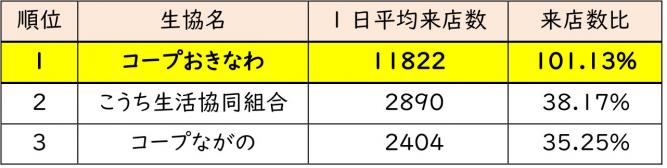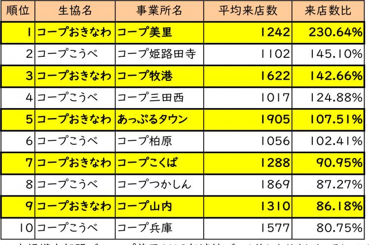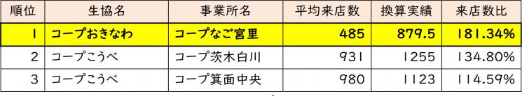 中規模店部門で、コープ美里が13年連続での1位となりました。そして、5店舗がベスト10入りしました。因みに、昨年度まで大規模店部門で1位だった、あっぷるタウンはコロナ禍の中で来店者数が2,000名を割り、中規模部門となり、5位に入賞しました。大規模部門ならば今年もダントツ1位の実績でした。