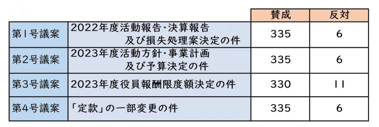 6月20日(火)コープおきなわ第48期通常総代会が開催されました。総代総数398人のうち、341人が議決に参加し、提案された第1~3号議案が賛成過半数、第4号議案が3分の2以上の賛成で可決されました。