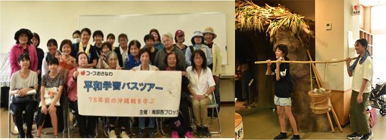 参加者からは「足がないので行けないと諦めていましたが、このバスツアーで行ってみたかったところにすべて行けて有意義でした。」「ひめゆり学徒隊の女生徒たちがしていた飯あげ体験を友だちと一緒にしたのですが、あまりの重さ、大変さに驚きました。地元の糸満以外のことも知ることができよかったです。」「りんごコープとJAコープをよく間違います。恥ずかしながらコープが平和活動をしていることを初めて知りました。」などの感想が寄せられました。平和学習バスツアーを開催していただいた、南部西ブロックの皆様に感謝します。