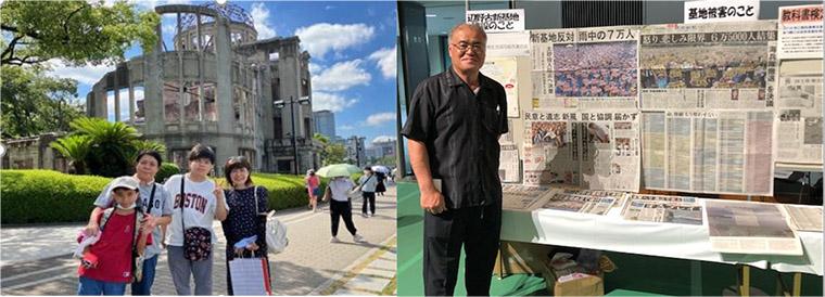 組合員大城さん・城間さん親子(原爆ドーム前) 虹のひろばで「沖縄」を伝える東江県連専務