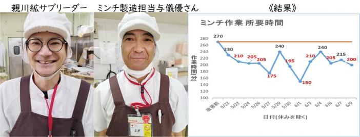 与儀さん談「1個1個のミンチの重量を気にし過ぎる余り、計量に時間がかかっていました。原料のカットも、丁寧過ぎたようで、大まかにカットすることで作業時間が早くなりました」