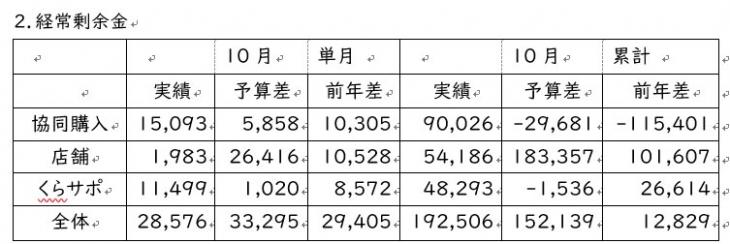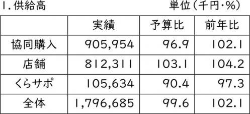 店舗が予算比103.1%と予算を超過しました。一方、協同購入では利用人数が予算に届かず、供給高予算割れに、くらしのサポート事業はハウジングの追加工事・遅延発生などで供給高予算割れとなりました。