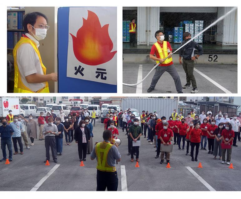 当日は浦添センター本部で働く、約100名の職員が参加して10:00の時報とともに火災発生を想定し発見者が非常ベルを押すところから訓練を開始しました。