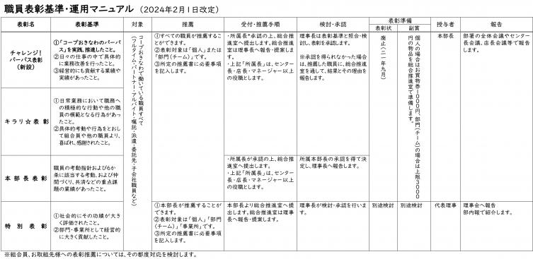 コープ美里 水産部門 畜産部門 農産部門 コープ寒川 惣菜部門、 コープなご宮里 惣菜部門 推薦者 品質管理室 宮平 勝さん 理由 第32回店舗インストア点検の結果、作業場の製造環境5S(整理・整頓・清掃・清潔・習慣)が9店舗29部門の中で最も衛生管理がしっかり行われている部門です。職員体制が厳しい中、各部門職員で工夫しながら日々の清掃を行い、食品を製造する作業環境をきれいに保っていました。今後も継続した取組で、組合員が安心して商品を購入できる作業場の衛生環境を 維持していただけるよう、キラリ表彰に推薦します。 |