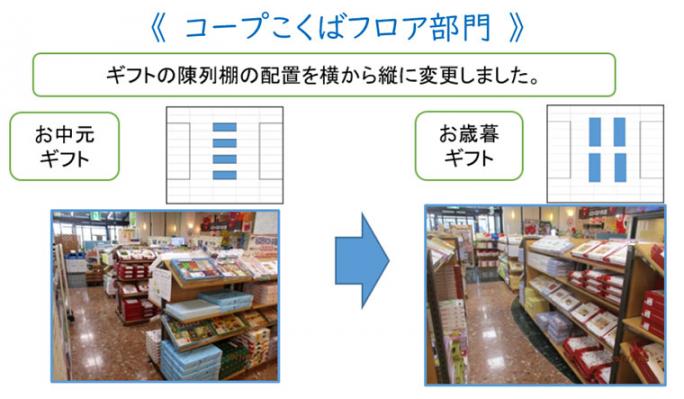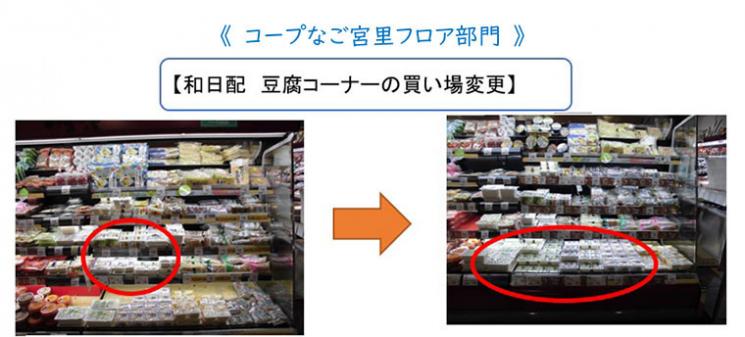 利用頻度の高い、「やっこ」「ミニ島豆腐2Pタイプ」を棚中段から下段に変更し、フェイス拡大することで、①供給高104.8%に伸長、②補充もし易くなり、作業効率も改善。