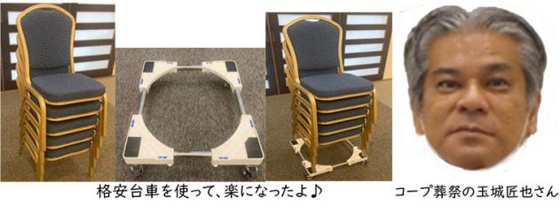 コロナ収束後、大人数の葬儀が増え、ホールから通夜室への椅子の移動回数も増えてきました。この間、一度に2~3台程度重ねて手で持ち上げて移動していましたが、腰への負担も大きく、どうにか楽に移動できないものかと考えていました。そこで取手のある金属式の移動台車を検討しましたが、1台数万円と高額なものばかりでした。それでも諦めずにネットや文具店を探し回り、税込み2,559円の台車を見つけました。使ってみると女性でも、5~6台重ねた状態で楽に移動でき肉体的負担も大きく軽減することが出来ました。
