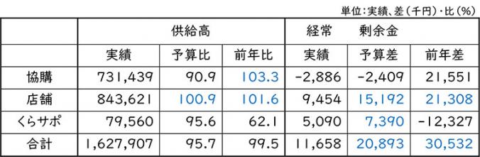 供給高は16.2億円で予算比・前年比ともに未達となりました。協同購入は前年は超過したものの予算比で約9ポイント落としました。くらしのサポート前年比の異常値は、ハウジングの追加受注による完了遅れによるものです。