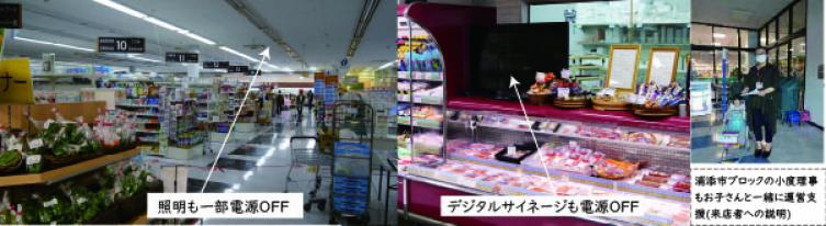 相談を受けた店舗支援部の嘉数さん、森さんは、コープ牧港のみなさんのご協力のもと、店内照明を開店前の照度、店内BGMやデジタルサイネージ&ボイスポップOFF、レジのスキャン音を最小にして実験運営にチャレンジしました。