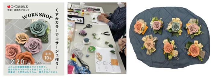 浦添市ブロックでは、サポーターの鈴木京子さんを講師に『WORKSHOPくすみカラーでコサージュ作り!』を開催しました。総勢11名の参加で、楽しくコサージュ作りに取り組みました。