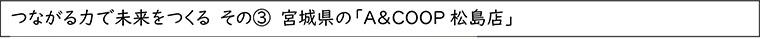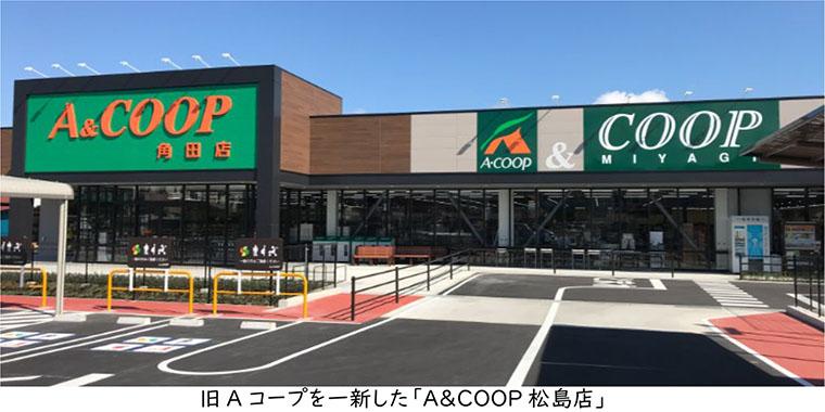 老朽化したAコープ松島店の建て替え計画中に、隣接するみやぎ生協松島店が閉店を決定し、JA全農みやぎとみやぎ生協が共同で「A&COOP松島店」をオープンさせました。農産、水産、畜産、惣菜、寿司部門をAコープが、日配、食品、生活関連をみやぎ生協が運営する形態となっています。なお、みやぎ生協は員外利用の関係で子会社として運営に加わり、組合員以外も利用できます。