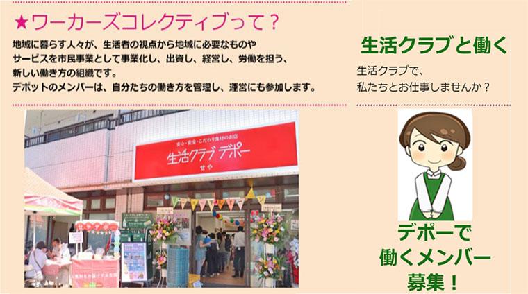 生活クラブ生協は、ワーカーズコレクティブ方式でデポー(小型のスーパーマーケット)を運営しています。ワーカーズコレクティブとは、地域に暮らす人々が、生活者の視点から地域に必要なものや、サービスを市民事業として事業化し、出資し、経営し、労働を担う、新しい働き方の組織です。