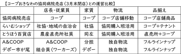 コープ協同病院売店では、ヒト・モノ・カネのすべての経営資源をコープおきなわが負担しているのに対し、今回の4事例には様々な工夫が見られます。主なポイントは、①員外利用の許認可、②地域の団体による店舗運営、③協同購入ルート活用によるコープ商品の品揃え、④協同組合間連携、⑤組合員(ワーカーズ)の運営参加、です。