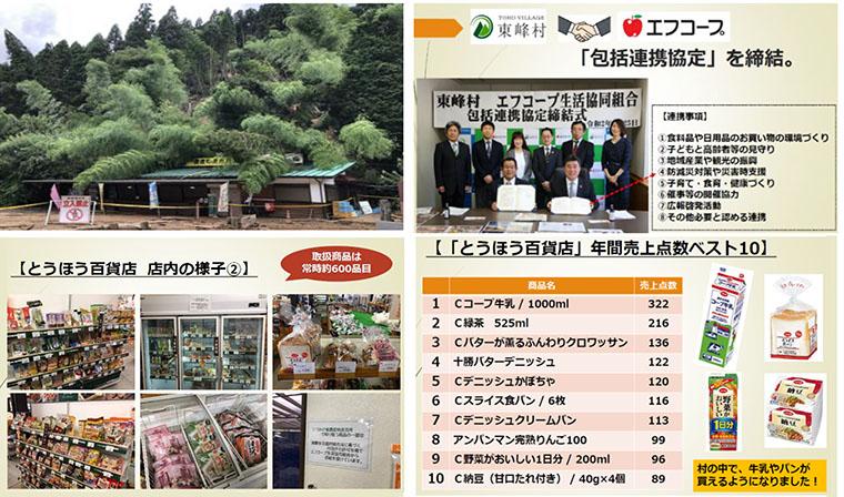 東峰村とエフコープでは「包括連携協定」を締結。とうほう百貨店にはコープ商品を中心に約600品目を品揃えしています。牛乳や食パン、骨とりさばや梅酢たこなどのコープ商品が村民にも人気です。