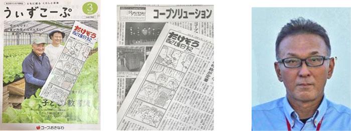 志喜屋さんは、機関紙うぃずこーぷ裏表紙の4コマ漫画「たけぞうくんの配達日記」の作者です。協同購入現場の「あるある」の事例をユーモアたっぷりに表現しています。同日記は全国の約60生協と、関係取引先約300社が毎月購読している月刊誌コープソリューションにも掲載されており、全国津々浦々で好評を博しています。。