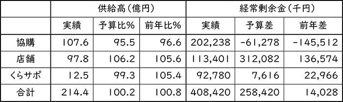 供給高は、214.4億円、経常剰余金は4.1億円で「増収増益」となりました。供給高の予算比・前年比の達成には店舗事業が貢献しました。経常剰余金は、協同購入が2.0億円で予算・前年は割れているものの貢献しています。特筆すべきは、店舗が前年を1.4億円改善し、1.1億円の黒字となったことです。