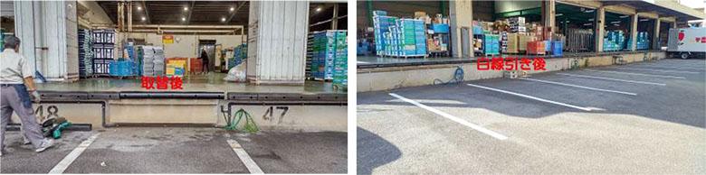 特に苦労したという意識はありませんが、しいて挙げるなら、協購センタープラットホームのゴムバンパーの加工取付作業は重量もあり、大変でした。また、駐車場のライン引きは、涼しい季節とはいえ、昼間の炎天下では厳しい作業でした。協購トラックの床の破損補修は、似たような材料を探し同じ厚さに調整したり、既存の床板を取り外すのに時間がかかったりと大変な作業でした。
