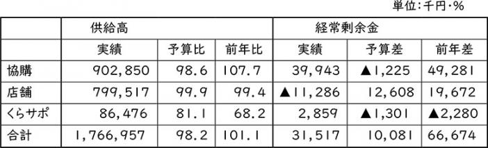 協同購入が前年比107.7%と全体を牽引しましたが、「曜日回り」の関係から、今年は前年よりも営業日数が2日多いことが主な要因です。店舗・くらしのサポートは予算・前年ともに未達となっており、供給高は総じて厳しい年度スタートとなりました。