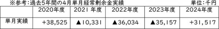 経常剰余金は、3.2千万円で、予算・前年ともに超過しました。例年4月は固定資産税の支払いが数千万円あり、過去5年間を見ても赤字となることが多い月となっています。今年は、2021年度のみなし自由脱退の出資金預り分82,373千円を「雑収入」に振り替えたことで、下記表の通り、コロナ禍最盛期の2020年度以来の4月経常剰余金黒字となりました。一見、好調な滑り出しのように見えますが、「曜日回り」「雑収入」がなければ、数千万円の赤字となり、実質は過去5年間で、最も厳しい年度スタートと認識する必要があります。