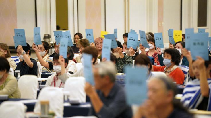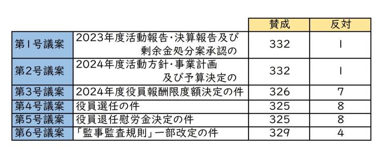 総代総数398人のうち、333人が議決に参加(議長2名を除く)し、提案された第1~6号議案が賛成過半数で可決されました。