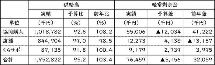 供給高は19.5億円で、予算比95.2%と予算には届きませんでした。協同購入の営業日が昨年より2日多いということもあって、前年実績は103.4%と超過しています。協同購入事業のギフト、約8300万円がシステム都合(請求週のズレ)で翌月にずれたことが予算未達の主な要因です。
