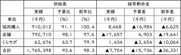 経常剰余金は、▲775万円で、予算、前年とも未達となりました。事業経費は予算内(96.6%)での執行でしたが、供給高の予算未達による収入減のため、予算に届いていません。