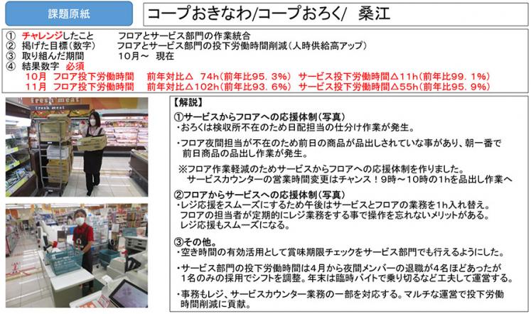 今回のような運営面の生産性を向上させる報告、供給高を引き上げる報告、日々の小さな問題点を改善・カイゼンした報告などです。そのような各店の皆さんの前向きな取り組みが積み重なって数値が変化しています。その数値的裏付けとして、投下時間が減少しています。これは残業を減らすというような単純なものではなく、今回のコープおろくの報告にあるような部門間の相互協力、他店からの学びを自店の真似びにつなげる、店舗商品部の仕入れ方法や店内備品管理、など多岐にわたる知恵・工夫を込めた考動があってこそです。とりわけ、「成功事例報告」を軸とした人時生産性改善の取り組みに学ぶことは多いように思います。次月でも取り上げて、学び(真似び)たいと思います。