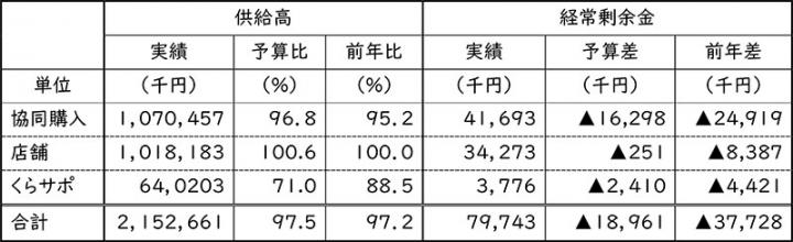 経費は予算内執行であったものの、供給高の低迷が続いているため、経常剰余は予算を約1900万円下回り、昨年実績も3700万円ほど下回っています。年度末に向け「組合員大感謝祭」などの取り組みをきっかけに、供給高の引き上げを図るとともに、経費の計画的な執行に引き続き取り組みます。