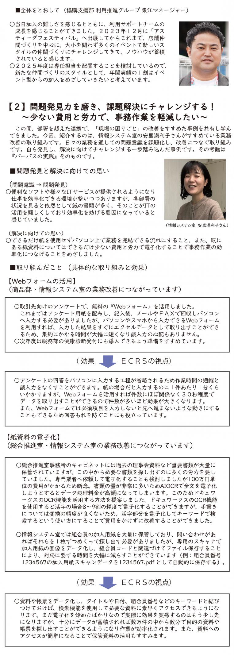 コープおろく 吉岡 まゆみさん 推薦者 コープおろく 西村 康太郎さん 理由 1月28日(火)おろく日報より 〇農産(宮城幸平さん): 吉岡さんが対応した組合員さんです。「みかんはどれが美味しいですか?」と聞かれたので試食してもらったところ温州みかんをご利用されたとの事です。 1月25日(土)おろく日報より 〇農産部門(宮城 幸平さん):お客様から『他の店でタンカン買ったら、全然美味しくなかったけどコープさんのはどんな感じですか』とお声掛けがあったので、吉岡さんが1玉切って試食して頂きました。美味しかったようで2ケースのご利用に繋がっています。 上記のように組合員さんやお客様の疑問に寄り添い、試食をして頂く事で商品への信頼を頂きご利用に繋がった考動は他の職員の模範となる事例と考えます。 きらり表彰に推薦致します。 2025年2月2週 |