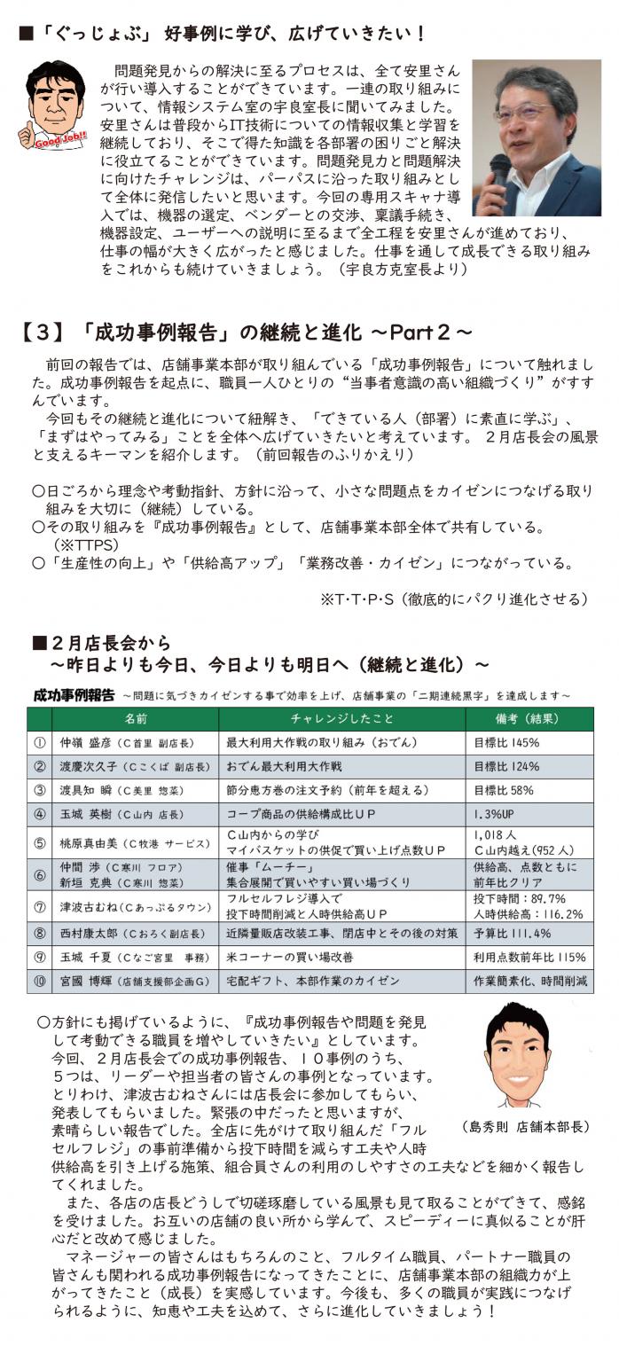 副理事長 渡久地 くにさん 推薦者 協同購入商品部 我那覇 一樹さん 理由 コープおきなわ農産 新たな産直産地「カラベジ」の調印式を行いました。その調印式・入雛式を行うにあたり職員だけでなく渡久地副理事長にもご挨拶の協力をいただきました。よりよい調印式・入雛式に出来るよう、事前打ち合わせの調整、また当日はご挨拶を行っていただき感謝いたします。結果として、多くの参加者が有意義のある式典にすることが出来ました。本当にありがとうございました。 2月1週 |