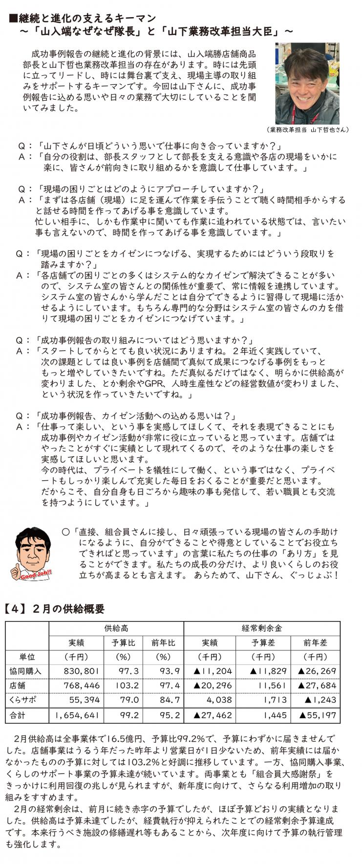 協同購入商品部 竹渕 淳さん 河野 成道さん 推薦者 協同購入商品部 我那覇 一樹さん 理由 コープおきなわ農産 新たな産直産地「カラベジ」を進めるため、取引先や関係者との調整や調印式の段取り、本当に長い期間をかけ実行していただきありがとうございました。それぞれの苦労もありましたが、生産者も消費者も「互いに努力を重ね、より良くなっていける関係」を目指す第一歩となりました。調印式では多くの方に参加していただき、生協の産直らしい風景が見え、それぞれが「とても良かった」と笑顔で帰る姿が印象的でした。 これからも組合員の声に応えていけるよう、ともに頑張りましょう! 2月1週 |