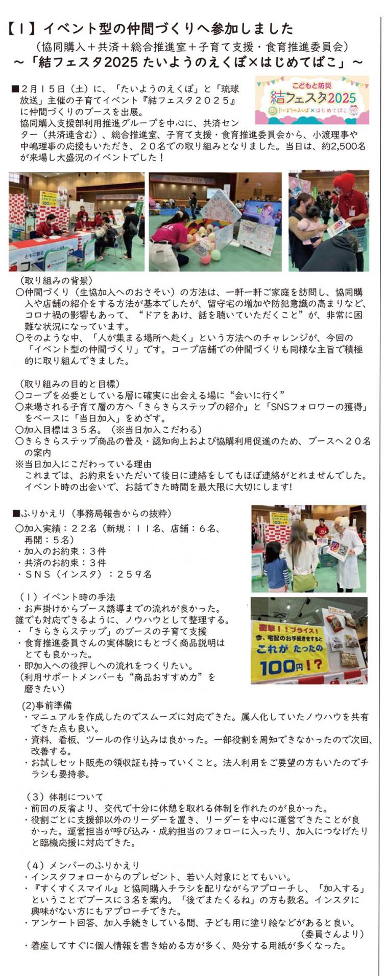 協同購入商品部 内間 和枝さん 推薦者 共済センター 比嘉 克啓さん 理由 1月25日(土)に開催した『くらしの見直し講演会』を大盛況で終えることができました。募集にあたって協同購入カタログのどの週に入れ込んだ方がより効果的かアドバイスをいただきました。おかげさまで配布1週間で定員に達することができました。お忙しい中、ご協力いただき誠にありがとうございました。感謝申し上げます。 2025年2月2週 |