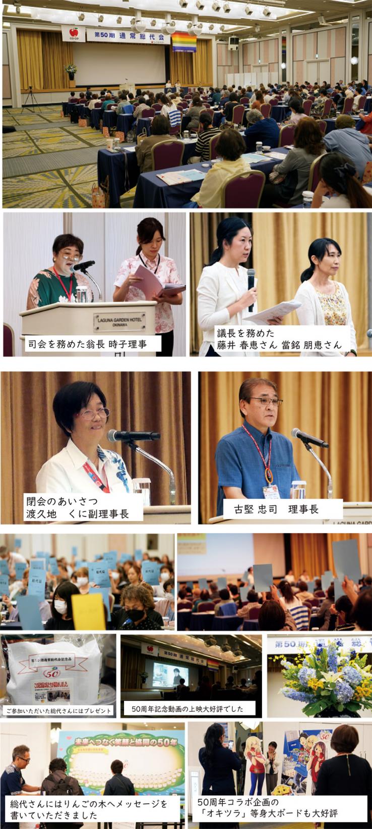 6月19日(木)コープおきなわ第50期通常総代会が開催され、総代総数397人のうち、342人が議決に参加し、提案された第1~3号議案は賛成過半数で可決されました。