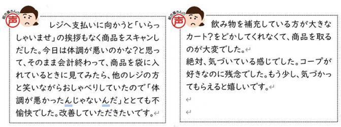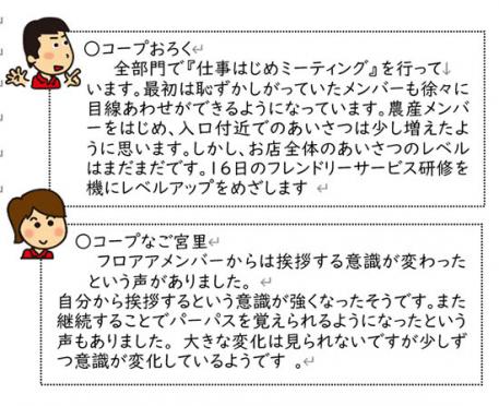 【3】組合員の「声」を受けて、 お申し出として寄せられた「組合員の声」をもとに、フレンドリーサービス(店舗運営の基本)についての事実(悪さ加減)を店舗事業本部全体で受け止め、なぜ? を繰り返し、要因を考えて、カイゼンする流れで、仕事(基本)の問い直しをすすめている事例紹介の続きです。 今回は、改善の流れを作った(最初に反応した)水産部門メンバーの受け止めと、店舗全体の取り組みについて紹介します。 ■寄せられた、お申し出・・。