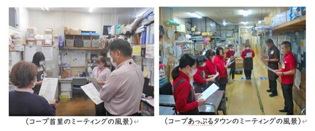 ○普段から組合員から寄せられた声は、お褒めの声もお申し出も水産部門の週次報告の中でも共有しています。褒められた声は、みんなで喜んだり、ご指摘を受けた声は改善に繋げたりしています。 ![]() ○コープおきなわに入協した理由の一つが、組合員さんとの距離が近い、組合員の思いや願いを実現している組織だったからです。自分自身も人と話すのが好きで、そういう環境も入協した理由です。普段の業務の中では、お魚をさばいたりする作業場内での業務が多いのですが、時々、買い場で組合員さんとお魚の話をしたり、商品の場所を聞かれたりした際に『ありがとうね~』の一言を頂く事は励みにもなりますし、素直に嬉しくなります。 (2)お店全体での行動変化 (仕事はじめミーティングで“基本”を大切に!) ![]() 全店、各部門でそれぞれ工夫をしながら※『仕事はじめミーティング』を実施しています。『何の為にやるのか?』ということを職員全員が理解し考動できるように、各店舗、各部門、店舗事業本部全体で共通のものにしてすすめる事が重要だと考えています。