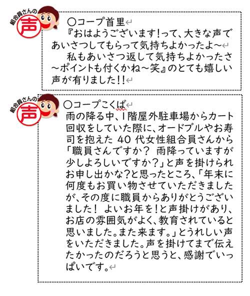 コープこくば 吉岡 海人さん 推薦者 コープこくば 渡慶次 久子さん 理由 年末年始のオードブルのご注文対応時に、組合員さんから「元気でいいね~!来年も元気に一年過ごせそう」と対応を褒めて頂きました。吉岡さんは普段から、笑顔で元気に挨拶、丁寧な対応を心掛けている事を聞いております。いつもありがとうございます。吉岡さんの考動は職員の模範となる考動と思い、キラリ表彰推薦致します。 1月1週 |
